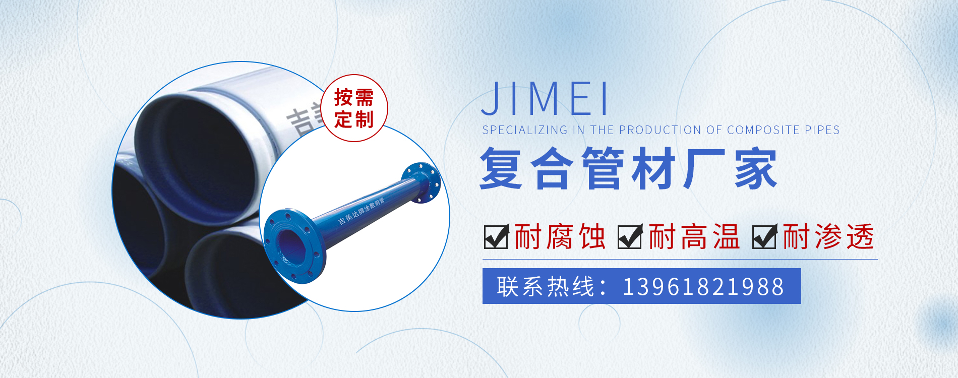常州市吉美管業(yè)有限公司,是一家專業(yè)生產復合管材的生產企業(yè)。 依靠公司技術力量和多年的實踐經驗,可年生產內襯塑、內襯外涂、內外涂PE、PEX、EP復合管道以及工業(yè)防腐管道等多種復合管材及管件10萬噸的生產能力。